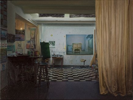 GALLERY (DESK) is on show in Palazzo Bembo together with the painting GREEN which is about half its size and the small scales (30 x 40 cm) ATELIER (24 PICTURES). GREEN with its almost monochromatic color, a plain, homogenous gradient from virtually black to dark-green, refers to the surface of the table depicted in GALLERY (DESK). ATELIER (24 PICTURES) corresponds both in motif and painting technique to GALLERY (DESK). It shows my working situation in the studio and documents – with GREEN and GALLERY (DESK) requoted in the painting – at the same time my preparation for the exhibition in Palazzo Bembo. GREEN fitsts in as an abstract painting between the two photorealistic works. They all share a meditative, melancholic mood and an expectant silence.