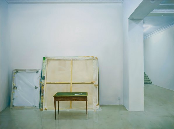 What does this mean when it comes to GALLERY (DESK)? The painting which was hung on the very wall depicted in the painting, during my exhibition at a Berlin gallery, shows an arrangement I found on the spot: A gallery room between two exhibitions. Wrapped up paintings, leaning face against the wall, waiting to be collected. In front of them a table with a dark-green surface and on it a sheet of paper. In the right hand corner a flight of stairs is suggested – where it leads we do not know. The melancholic atmosphere and the suspenseful tranquility intrigued me. The old is drawing to a close, the new has not arrived yet – a vanitas motif. In this image my everyday reality regarding the aspects of time, space and existence is reflected. Even though I was unaware of it at the time, in this everyday situation, so profane to me, a metaphor for my meaning of life was revealed: Who am I? Where do I come from? What do I do? This painting is - in the way that it is painted - a meditation on those questions. It is an attempt to create a maximum energetic impact that expresses my existential situation and its emotional and spiritual connections by using the sensual means of painting.